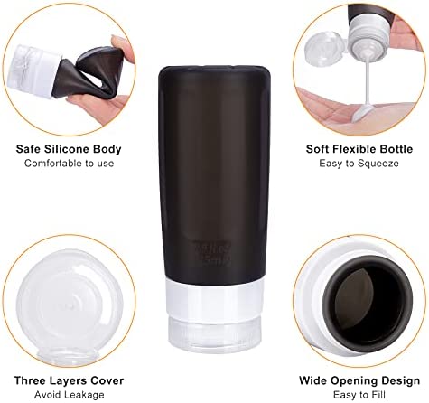 【SAFE SILICONE MATERIAL】 Made of Food Grade BPA Free Silicone, this travel set is sturdy, soft, squeezable, flexible and reusable. Safe material guarantee that you can not only use them to store shampoo, conditioner, face soap, sunscreen, creams, lotion or etc, but also safe for food, various seasonings. Soft silicone body make you squeeze out contents easily.