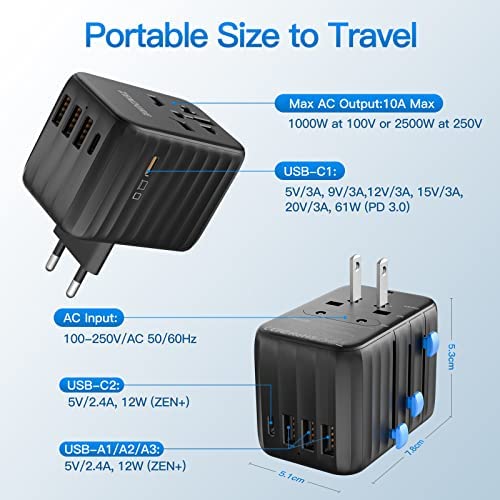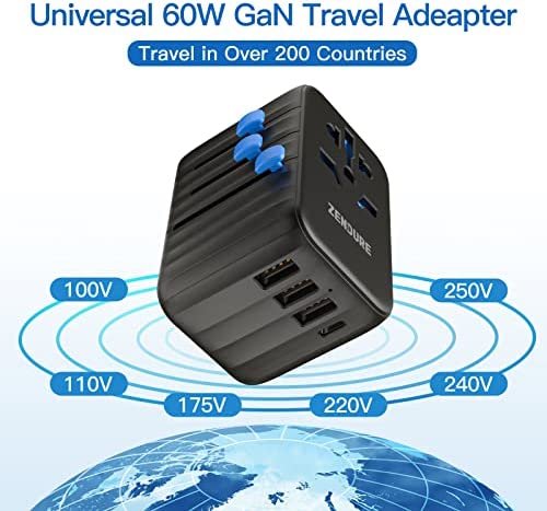 Zendure Universal Travel Adapter 61W PD Fast Charger One International Wall Charger AC Plug Adaptor Worldwide Power Charger All in One Compatible with MacBook Pro Laptops iPad iPhone More Black